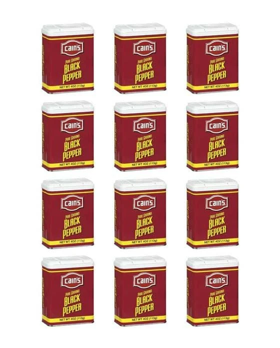 This sale is for 12 bottles of Cain’s Pure Ground Black Pepper, 12 bottles – 4 oz each